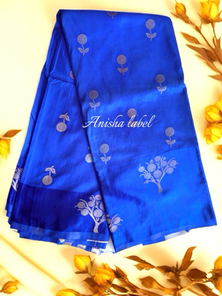 BLUE PURE MASHRU SATIN SILK SAREE WITH ALLOVER ANTIQUE ZARI FINE WEAVING FLOWERS